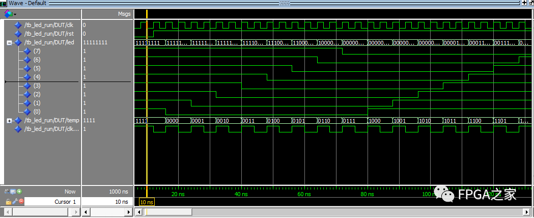 下面以FPGA板中驅(qū)動流水燈的一段程序為例,簡單介紹一下兩種語言的TestBench的編寫。