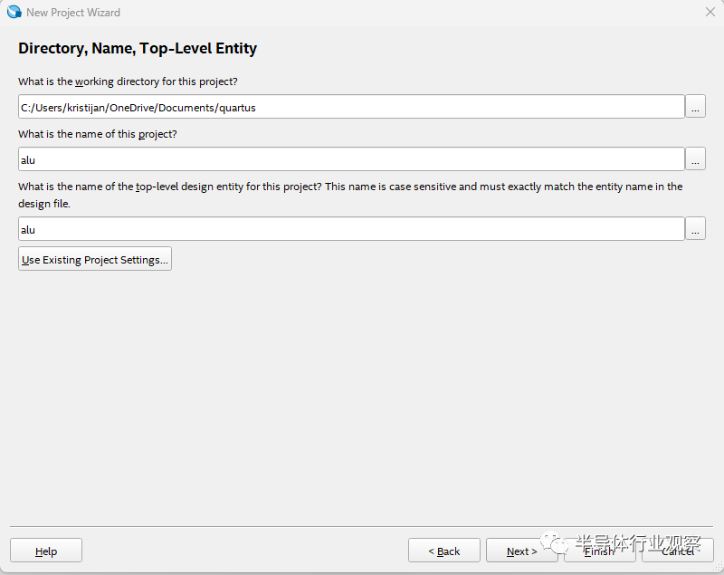 如圖 4 所示,在名為“目錄、名稱、頂級實體”的第二個屏幕上,我們需要選擇之前創(chuàng)建的文件夾作為工作目錄,并為當(dāng)前項目指定適當(dāng)?shù)拿Q。我將這個項目命名為“ALU”。