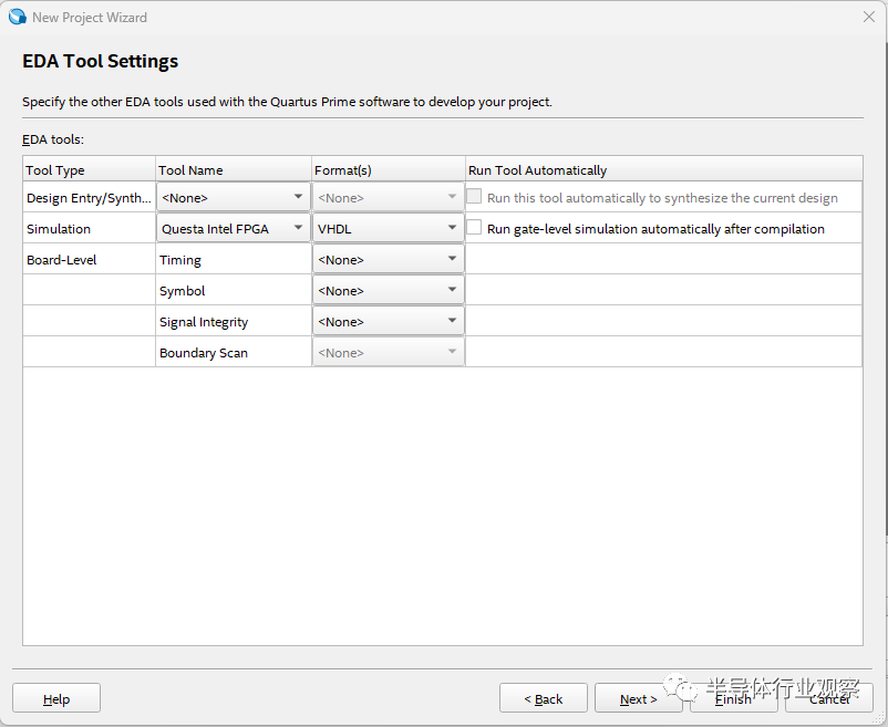 接下來,我們需要在“EDA Tool Settings”屏幕上將“Verilog HDL”更改為“VHDL”,單擊“下一步”,并檢查“Summary”中的一切是否正確(圖7)。之后,我們可以單擊“完成”按鈕,我們的新項目將被創(chuàng)建。