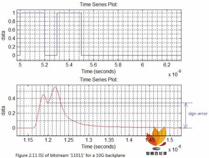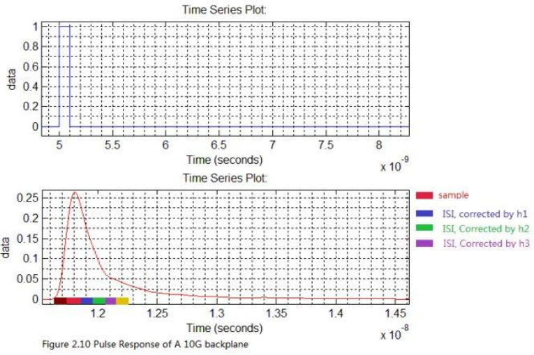 圖2.10中,一橫格代表一個UI的時間??梢钥闯觯粋€UI( 0.1nS = 1/10GHz )的脈沖信號,通過背板后,泄漏到前后多個相鄰的UI里面,從而對其他UI的數(shù)據(jù)產(chǎn)生干擾。采樣點后面的干擾叫做post-cursor干擾,采樣點前面的叫做pre-cursor干擾。DFE的第一個系數(shù) h1(此例中0.175)矯正第一個post-cursor, 第二個系數(shù) h2(此例中0.075)矯正第二個post-cursor。DFE的階數(shù)越多,能夠校正的post-cursor也越多。