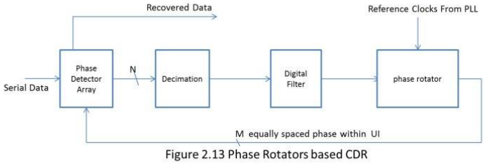 圖2.13是基于相位插值器的CDR。鑒相器陣列對輸入的串行數(shù)據(jù)與M個等相位間隔的時鐘在多個UI的跨度上進行相位比較,得到多個UI跨度上的相位誤差信號。相位誤差信號的頻率很高,寬度也很寬,經(jīng)過抽取器降速并平滑后,送給數(shù)字濾波器。數(shù)字濾波器的性能會影響環(huán)路的帶寬,穩(wěn)定性,反應(yīng)速度等。經(jīng)數(shù)字濾波器平滑后的誤差信號送給相位插值器(phase rotators)修正時鐘相位。最終環(huán)路鎖定時,理論上相位誤差為零,90度偏移的時鐘作為恢復(fù)時鐘采樣串行輸入。