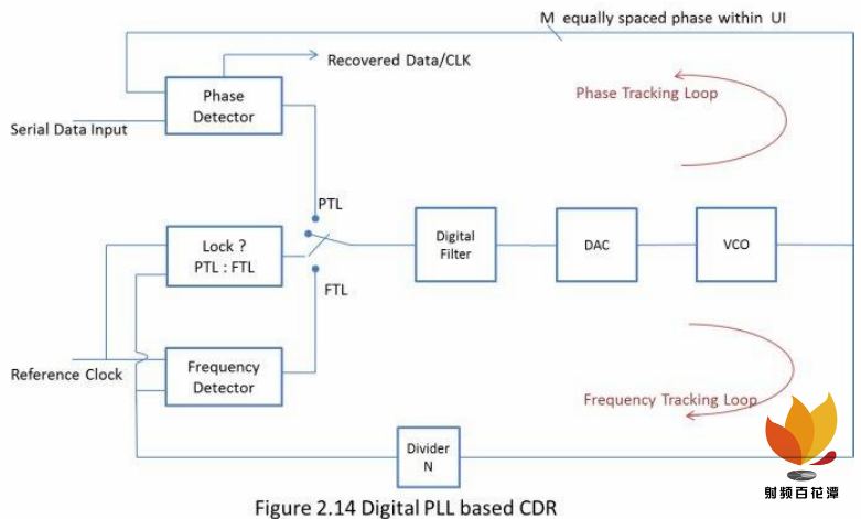 圖2.14是基于DPLL的CDR, 分為兩個環(huán)路,對數(shù)據(jù)鎖相的環(huán)路(phase tracking loop)和圖2.13的CDR工作原理類似。鑒相器陣列對輸入的串行數(shù)據(jù)與M個等相位間隔的時鐘進行相位比較(也可能是在多個UI的跨度上),得到相位誤差信號。相位誤差信號送給數(shù)字濾波器。數(shù)字濾波器的性能會影響環(huán)路的帶寬,穩(wěn)定性,反應(yīng)速度等。經(jīng)數(shù)字濾波器平滑后的誤差信號送給VCO修正時鐘相位。最終環(huán)路鎖定時,理論上相位誤差為零,90度偏移的時鐘作為恢復(fù)時鐘采樣串行輸入。