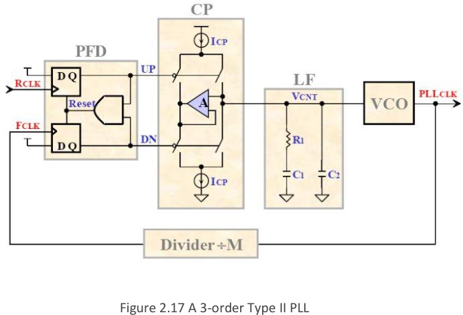 一個三階PLL電路如圖2.17,輸入信號的相位和VCO反饋信號的相位由鑒相器比較,相位誤差有charge pump轉(zhuǎn)化為電壓或電流信號,經(jīng)過Loop Filter平滑后產(chǎn)生控制電壓,修正VCO的相位,最終使相位誤差趨于零。