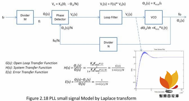 PLL的工作過程分為入鎖過程和跟蹤過程。在入鎖過程,環(huán)路的模型可以用一個非線性微分方程表示,可以評估捕獲時間,捕獲帶寬等指標(biāo)。入鎖后,在小信號范圍內(nèi),PLL的模型是一個常系數(shù)線性方程,可以在拉普拉斯變換域研究PLL的帶寬,增益,穩(wěn)定性等性能, 圖2.18是小信號數(shù)學(xué)模型。