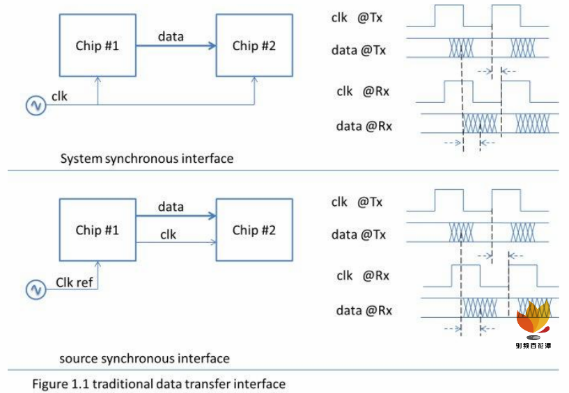 在SerDes流行之前,芯片之間的互聯(lián)通過系統(tǒng)同步或者源同步的并行接口傳輸數(shù)據(jù),圖1.1演示了系統(tǒng)和源同步并行接口。