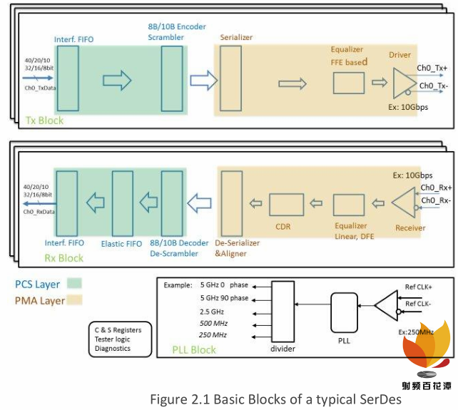 圖中藍色背景子模塊為PCS層,是標(biāo)準(zhǔn)的可綜合CMOS數(shù)字邏輯,可以硬邏輯實現(xiàn),也可以使用FPGA軟邏輯實現(xiàn),相對比較容易被理解。褐色背景的子模塊是PMA層,是數(shù)?;旌螩ML/CMOS電路,是理解SerDes區(qū)別于并行接口的關(guān)鍵,也是本文要討論的內(nèi)容。