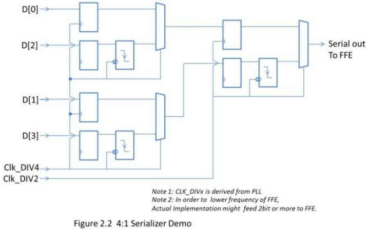 一個4:1的串行器如圖所示。8:1或16:1的串行器采用類似的實現(xiàn)。實現(xiàn)時,為了降低均衡器的工作頻率,串行器會先把并行數(shù)據(jù)變?yōu)?bits,送給均衡器equalizer濾波,最后一步再作2:1串行化,本文后面部分都按1bit串行信號解釋。