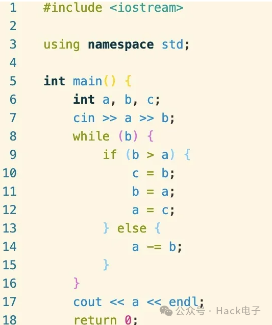 下圖是該過(guò)程的C++實(shí)現(xiàn),輸入a和b,當(dāng)b不為0時(shí),不斷進(jìn)行上述過(guò)程直到b為0,此時(shí)a為最大公約數(shù)。各位同學(xué)有興趣可以自行仿真上述代碼并通過(guò)單步調(diào)試觀察中間過(guò)程。
