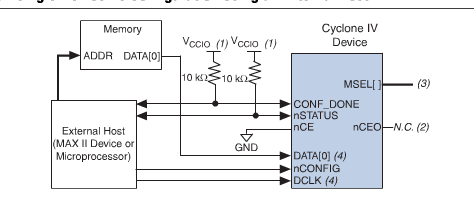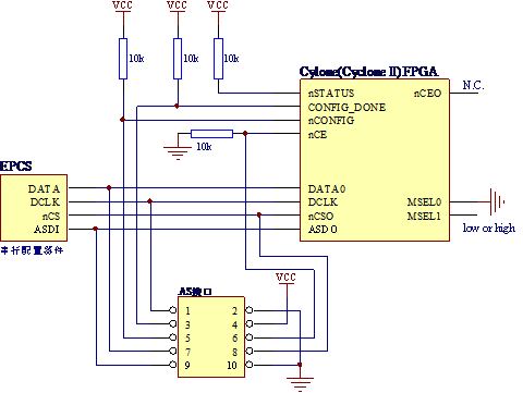 因為FPGA上的nSTATUS、CONFIG_DONE管腳都是開漏結構,所以都要接上拉電阻。FPGA的片選腳nCE必須接地。