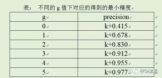 其中0.1d1d2d3…dn。對于輸出位寬m=k+g,能得到的設(shè)計(jì)精度如下表格: