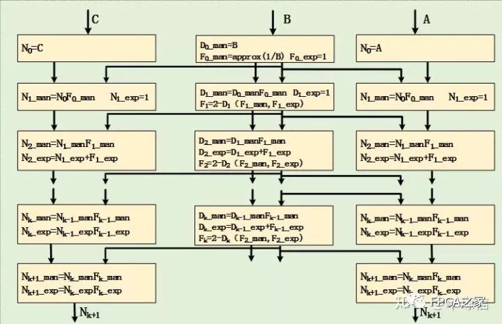 另外在實(shí)現(xiàn)多分子單分母,形如(A+C)/B,為了更省時(shí)間和空間資源可以采取如下圖所示的實(shí)現(xiàn)策略:
