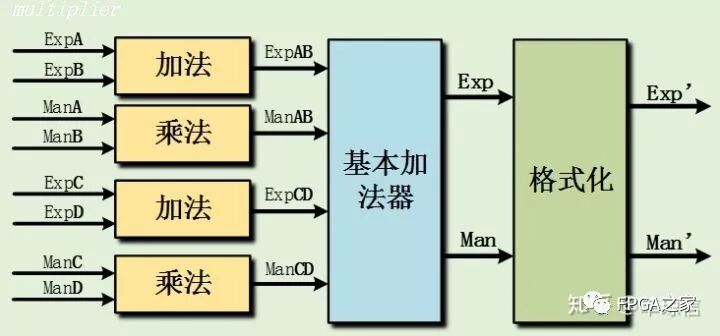 這樣即可省去乘法器中的格式化過程,將乘法的中間結(jié)果直接輸入給加法器,最后再進(jìn)行格式化輸出。