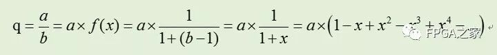 其中Ni和Di分別是算法執(zhí)行i步后得到的分子和分母。當(dāng)Di趨近1時(shí),Ni就趨近于q了。迭代開始時(shí),令N0=a,D0=b。第一次迭代,時(shí),N1 = R0*N0,其中R0 = 1-x = 2-b??傻玫饺缦?
