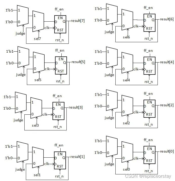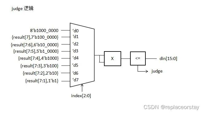 數(shù)據(jù)通路的關(guān)鍵是如何依次對result每一位判斷是否為1,這里引入中間信號index[2:0],用來記錄當前應該對哪一位數(shù)操作,這里的index可以為計數(shù)器輸出的低三位,再由index和乘法器比較器輸出中間信號judge,用來判斷該位是否為1,由index和常數(shù)進行比較產(chǎn)生selx信號,作為MUX的選擇信號,最后用judge和selx驅(qū)動MUX輸出result的每一位。