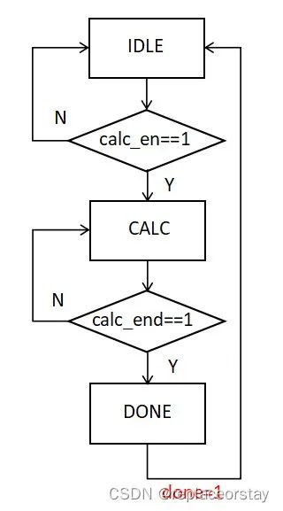 首先分析運算過程考慮器件復用,決定采用時序電路多周期計算??梢詫⒖刂仆返臓顟B(tài)劃分為三個狀態(tài):IDLE,CALC,DONE。IDLE表示空閑,只有輸入一個使能信號calc_en才能啟動計算,即進入CALC狀態(tài),這個狀態(tài)主要用于輸出數(shù)據(jù)通路使用的觸發(fā)器flip-flop的使能端,用以存儲計算中產(chǎn)生的信號,待計算達到一定的程度時輸入信號calc_end有效后狀態(tài)進入DONE,即完成狀態(tài),此時輸出done信號表示計算結(jié)束。為了比較各個算法實現(xiàn)的電路的性能,在CALC狀態(tài)還應該輸出一個計算器的計數(shù)使能,用于對計算所用時鐘周期的計數(shù)。通過以上分析可以得到以下的狀態(tài)轉(zhuǎn)換圖和輸出信號表。