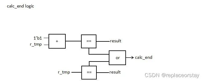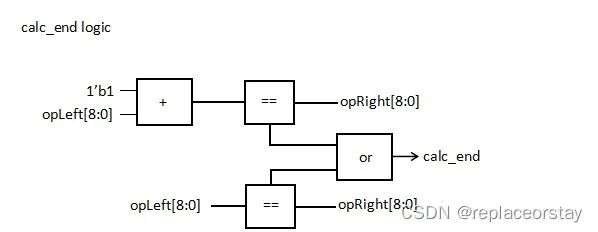 那么問題來了,怎么判斷計算結(jié)束了呢?我們通過上文二分法的例子發(fā)現(xiàn)計算完成時左操作數(shù)與右操作數(shù)不是相等就是差1,于是可以有以下的邏輯輸出calc_end,再輸入給狀態(tài)機使狀態(tài)跳轉(zhuǎn)。