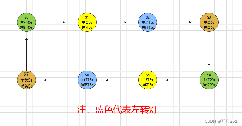 2. 如果復(fù)位信號為高電平,則根據(jù)當(dāng)前的狀態(tài)(state)執(zhí)行相應(yīng)的操作。3. 當(dāng)前有三種狀態(tài)(S0、S1、S2),對應(yīng)不同的燈光控制邏輯。 - S0狀態(tài):主路綠燈亮,持續(xù)45s。 - S1狀態(tài):主路黃燈亮,持續(xù)5s。 - S2狀態(tài):其他狀態(tài),可以在代碼中后續(xù)定義。 如此下去直到進(jìn)行循環(huán)。具體的操作是根據(jù)一個(gè)計(jì)數(shù)器(Cnt70)來控制。當(dāng)計(jì)數(shù)器的值小于等于給定的時(shí)間時(shí),對應(yīng)的LED燈亮起;否則,切換到下一個(gè)狀態(tài)。