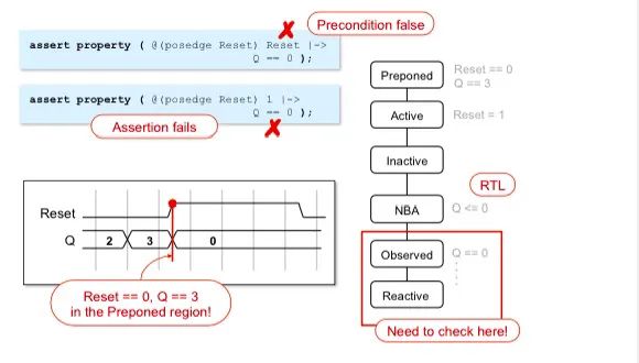 SVA 屬性需要一個時鐘事件,使它們本質上是同步的。當描述異步行為時,SystemVerilog 調度語義使得這一點難以檢查,因為斷言輸入值是在觸發(fā)器上升沿之前采樣的。