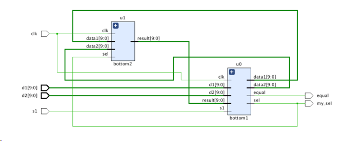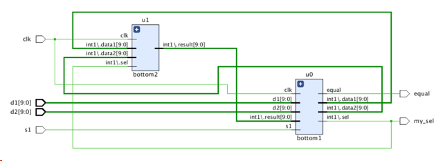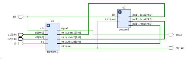 上面的 RTL 會(huì)對(duì)“bottom2”模塊進(jìn)行實(shí)例化,給它指定一個(gè)實(shí)例名稱“u1”。 在“bottom2”模塊中聲明的接口“int1”現(xiàn)在與已在上一層聲明的接口“int3”相關(guān)聯(lián)。 進(jìn)行這些更改后,設(shè)計(jì)的原理圖如下所示: