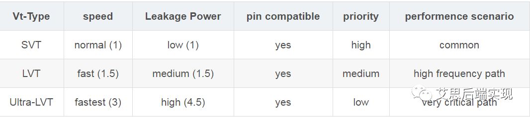 從上一篇文章可以看到,不同Vt下的cell特性是不同的,現(xiàn)在的工藝都會提供不同傾向的Vt庫,見下表