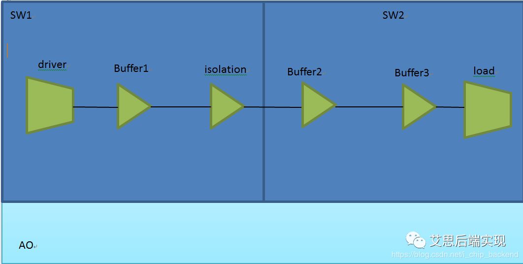 一條路徑,從SW1出發(fā)到達SW2,中間一共有四級,其中SW里邊有一個buffer和一個isolation,AO里邊,有兩個buffer ,從power上講,在SW1和SW2同時關(guān)斷的時候,這兩個AO的buffer,不會有任何的動態(tài)功耗(dynamic power),這是因為SW1的isolation的輸出已經(jīng)被鉗位(clamp)到無效態(tài)(一個常值),但是這兩個buffer的leakage power是不能省略的,所以下圖的floorplan,從power優(yōu)化上來講一定是個更好的選擇