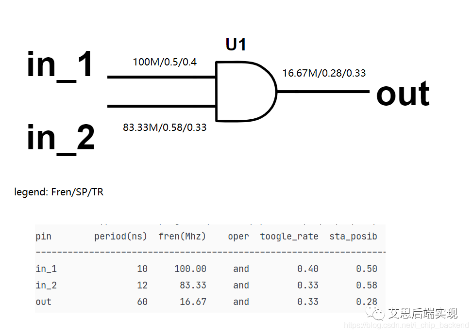目前為止,有了TR和SP就可以展開對leakage_power和internal_power的計算。在實際的芯片里邊,可以使用一些手段來計算器件的TR和SP,為此,筆者使用python完成了一個這樣的一個功能:基于輸入管腳對簡單組合邏輯進行輸出管腳的TR和SP的計算: