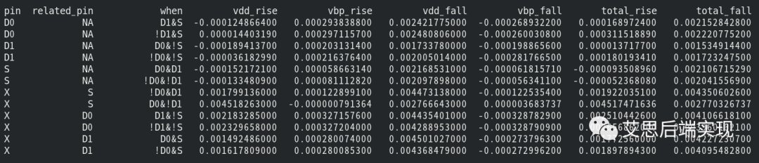 以MUX2 為例,一起看一下interenal power的描述:cell ("SEL_MUX2_4") { ...... pin (S) { capacitance : 0.002820029; direction : "input"; fall_capacitance : 0.002761232; max_transition : 4.308; related_ground_pin : VSS; related_power_pin : VDD; rise_capacitance : 0.002878826; internal_power () { # bias PG related internal_power description related_pg_pin : "VBP"; # condition when : "!D0&!D1"; fall_power ("pwr_tin_8") { index_1 ("0.009266, 0.0222816, 0.0535798, 0.1288418, 0.309822, 0.745016, 1.791516, 4.308"); values ("-5.63411e-05, -5.540512e-05, -6.377697e-05, -4.595821e-05, -6.756144e-05, -6.15605e-05, -6.171516e-05, -6.163207e-05"); } rise_power ("pwr_tin_8") { index_1 ("0.009266, 0.0222816, 0.0535798, 0.1288418, 0.309822, 0.745016, 1.791516, 4.308"); values ("8.111282e-05, 7.08698e-05, 5.968669e-05, 5.155256e-05, 5.807869e-05, 6.204414e-05, 6.182517e-05, 6.175735e-05"); } } internal_power () { # common PG related internal_power description related_pg_pin : "VDD"; # condition when : "!D0&!D1"; # the internal_power during pin S falling edge fall_power ("pwr_tin_8") { index_1 ("0.009266, 0.0222816, 0.0535798, 0.1288418, 0.309822, 0.745016, 1.791516, 4.308"); values ("0.002097898, 0.00210684, 0.001989685, 0.002036636, 0.001995899, 0.001987284, 0.001991492, 0.002053458"); } # the internal_power during pin S rising edge rise_power ("pwr_tin_8") { index_1 ("0.009266, 0.0222816, 0.0535798, 0.1288418, 0.309822, 0.745016, 1.791516, 4.308"); values ("-0.0001334809, -6.114718e-05, -0.000153519, -0.0001819992, -0.0002029397, -0.0002175415, -0.0002181976, } } } ...... pin (X) { direction : "output"; function : "((D0&!S)|(D1&S)|(D0&D1))"; max_capacitance : 0.8309614; max_transition : 4.308; min_capacitance : 6.155e-05; related_ground_pin : VSS; related_power_pin : VDD; power_down_function : "!VDD+!VBP+VSS+VBN"; internal_power () { related_pg_pin : "VBP"; # Path Dependency related_pin : "D0"; # Status Dependency when : "!D1&!S"; # X: falling edge power due to related D0 change. positive unate fall_power ("pwr_tin_oload_8x7") { index_1 ("0.009266, 0.0222816, 0.0535798, 0.1288418, 0.309822, 0.745016, 1.791516, 4.308"); index_2 ("6.155e-05, 0.000300464, 0.00146675, 0.00716013, 0.0349531, 0.170628, 0.832941"); values ("-0.0003287909, -0.0003265358, -0.0003263012, -0.0003258171, -0.0003259071, -0.0003233576, -0.0003219219", \ ...... "-0.0003294999, -0.0003285813, -0.0003292956, -0.0003293134, -0.0003286557, -0.0003291086, -0.0003283838"); } # X: rising edge power due to related D0 change. positive unate rise_power ("pwr_tin_oload_8x7") { index_1 ("0.009266, 0.0222816, 0.0535798, 0.1288418, 0.309822, 0.745016, 1.791516, 4.308"); index_2 ("6.155e-05, 0.000300464, 0.00146675, 0.00716013, 0.0349531, 0.170628, 0.832941"); values ("0.000327204, 0.000329085, 0.0003304601, 0.0003274369, 0.0003265309, 0.0003275536, 0.0003209762", \ ...... "0.0003299443, 0.000328975, 0.0003286823, 0.0003299806, 0.0003291929, 0.0003285925, 0.0003283199"); } } } ...... }可以看到,internal power除過是status dependency,同時也是path dependency?;趇nternal power的特性,這里也同時需要考慮 input tran和output_cap的狀態(tài)。通過腳本抽取,可以看到如下特性: