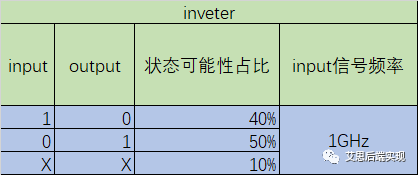 在實際的芯片當(dāng)中,一個器件在不同時間的表現(xiàn)狀態(tài)可以不同,這里就像一個真值表,假定設(shè)計里邊有如下一個inverter器件的工作狀態(tài)。