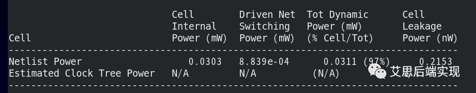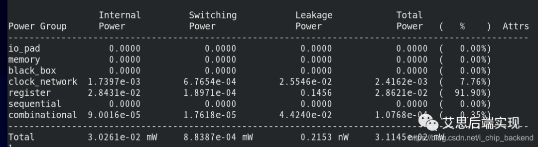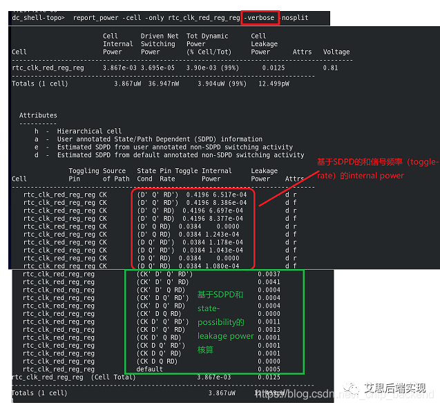 EDA工具提供了相應的信息和抽取方式來擬合library的描述。以常用的DC工具里的report_power命令為例,工具會羅列出下面的功耗信息: