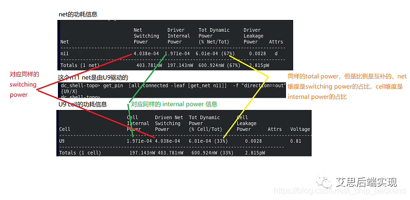 從上文描述中可以看到,net會描述switching power,cell對標的則是internla power和leakage power。但是工具在產(chǎn)生報告的時候,無論是net還是cell都會把三類功耗打印完全,這里是使用output pin對應的net來做的cell、net歸一化處理