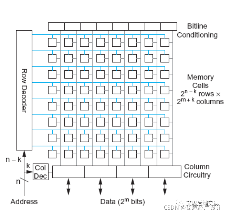 這里很明顯可以看到控制邏輯的身影,從外部訪問方便而言,它們對memory array成包圍模式。更為真實的SRAM結構如下圖所示,