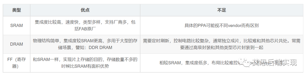 對于大型芯片而言,以上種種可能都會用到,但是最普遍,占比最大的還是第一類,這里使用下表對三種存儲方式各自的特點進行一個拆解