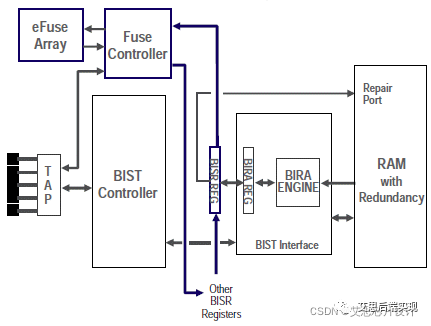 step_3:如果可修復(fù),在ATE模式下,通過利用redundancy bit,對(duì)memory 進(jìn)行修復(fù),如果此時(shí)MBIST的測(cè)試可以通過,則相關(guān)信息燒錄進(jìn)在EFUSE里邊。