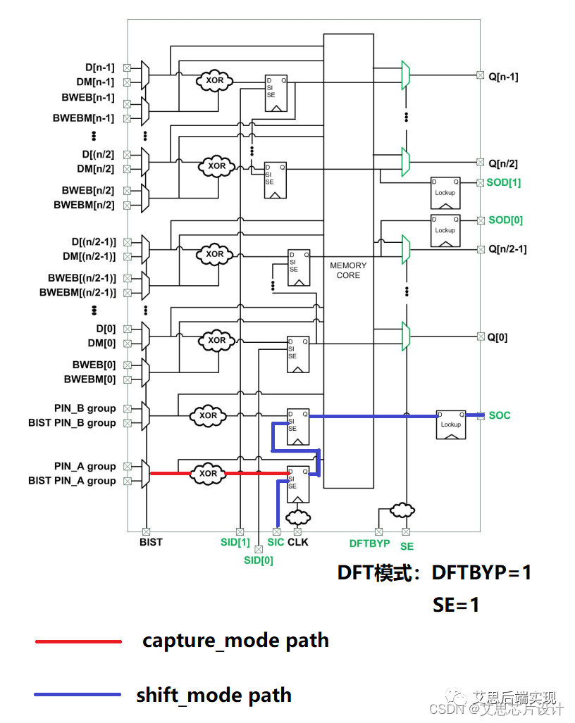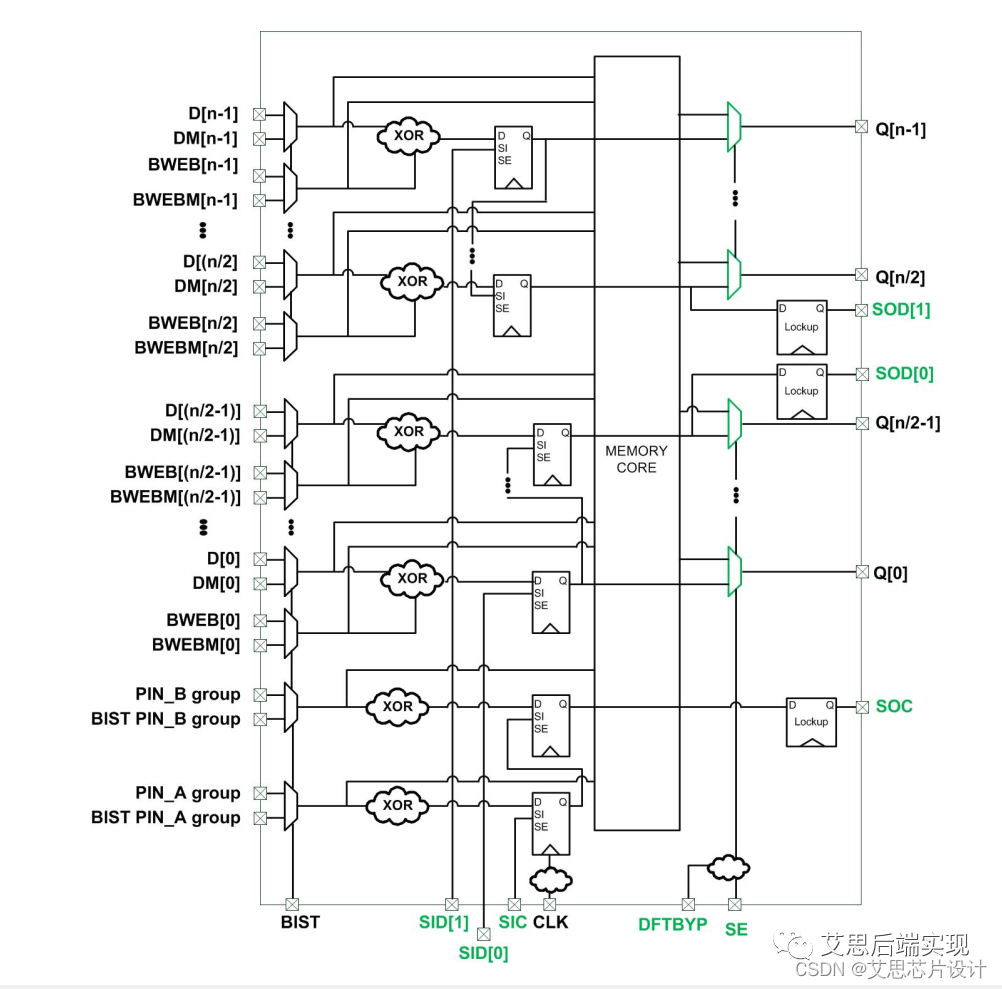 - BIST測(cè)試:Built-in self-test,,顧名思義,這個(gè)是對(duì)memory 的物理存儲(chǔ)特性進(jìn)行的自測(cè)和錯(cuò)誤標(biāo)記,在遇到錯(cuò)誤數(shù)據(jù)的時(shí)候,可以使用內(nèi)部bypass/mux的方式,將正確地?cái)?shù)據(jù)讀取、寫入到其他的地方。這里的BIST是給memory使用,通常也叫做MBIST。所有和BIST測(cè)試相關(guān)的管腳,都是可以MBIST邏輯,對(duì)memory進(jìn)行強(qiáng)制管控。