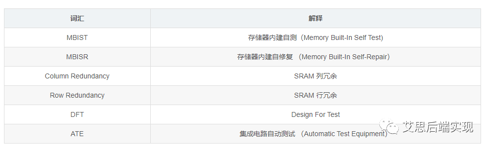MBIST是使用BIST邏輯對(duì)memory進(jìn)行測(cè)試的一種方式,可以定位出SRAM的壞點(diǎn),并且通過調(diào)用column/row的redundancy來進(jìn)行修復(fù)(通常也稱為MBISR:SRAM自修復(fù)功能)。MBIST的測(cè)試方法高效,和帶有redundancy bit的memory聯(lián)動(dòng)使用可以有效提升芯片的良率?;驹韴D如下