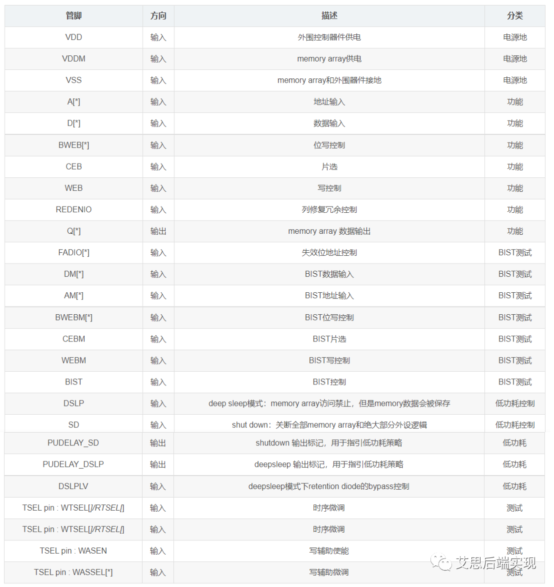 - 低功耗:基于memory的使用場(chǎng)景,memory 可以分為shut-down、deep-sleep和normal模式。譬如本級(jí)模塊是一個(gè)可關(guān)斷domain,在關(guān)斷std-cell邏輯之前,需要對(duì)于memory的SD/DSLP進(jìn)行拉高(使能),讓memory進(jìn)入到不同的工作模式以節(jié)省功耗。PS:如果在DSLP模式下,VDDM掉電,memory的內(nèi)容會(huì)丟失