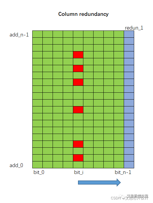 這里的bit_i (第i列)的bitcell有損壞,這個(gè)時(shí)候,所有寫入到bit_i的數(shù)據(jù)依次右移,直至bit_n-1移動(dòng)到redun_1列,這個(gè)時(shí)候,可以通過redun_1避免整塊memory的失效。