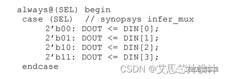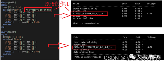 基于此,通過對RTL進行原語級別的配置,讓elaborate對case的結(jié)果進行約束。示例語法如下: