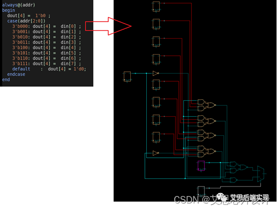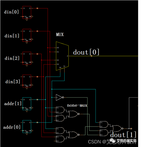 可以看到,DC工具在infer_mux的dout[0]通路上使用了一個四輸入的MUX做了實現(xiàn),但是在dout[1]的通路上選擇的常規(guī)的與或非邏輯作實現(xiàn)。
