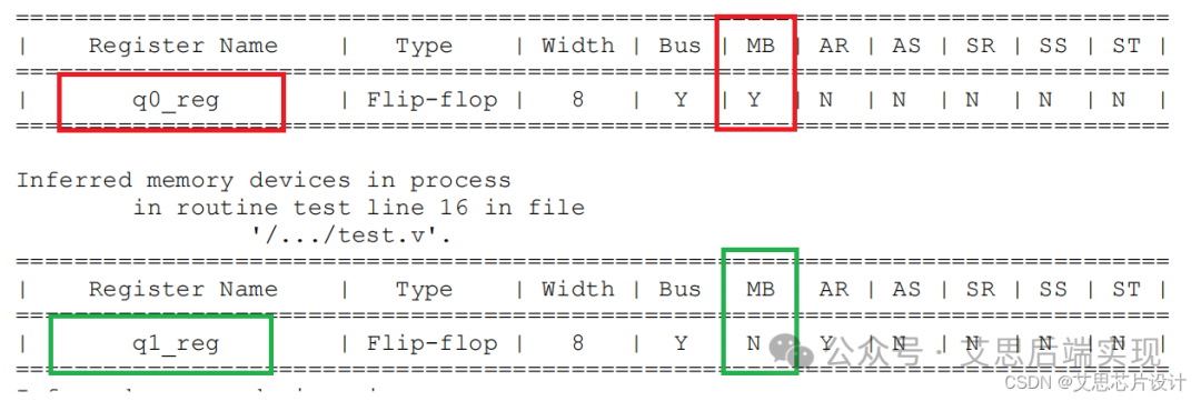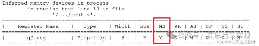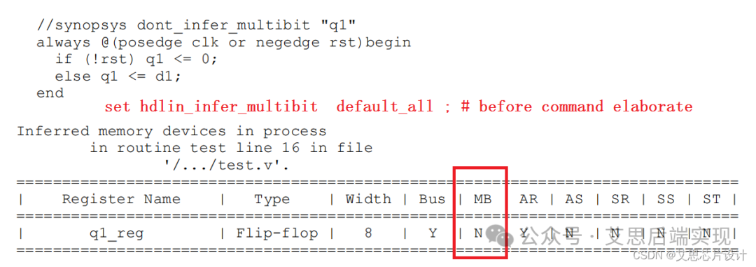 RTL的MBFF是通過簡單的原語來進(jìn)行MBFF封裝指定(infer_multibit)或者M(jìn)BFF封裝排外指定(dont_infer_multibit)。除過elaborate對MBFF進(jìn)行未映射(unmapped)級(jí)別的封裝,綜合流程主要還是通過compile等命令來進(jìn)行MBFF的映射(mapped)實(shí)現(xiàn)的。無論是RTL使用原語對MBFF進(jìn)行指定,抑或使用hdlin_infer_multibit=default_all進(jìn)行MBFF識(shí)別,任何在elaborate階段的FF,只有存在MB==Y的情形,才是有可能在后期通過compile命令完成MBFF的封裝,譬如下圖的q0_reg,在compile命令執(zhí)行中,才是有可能被映射實(shí)現(xiàn)成MBFF的