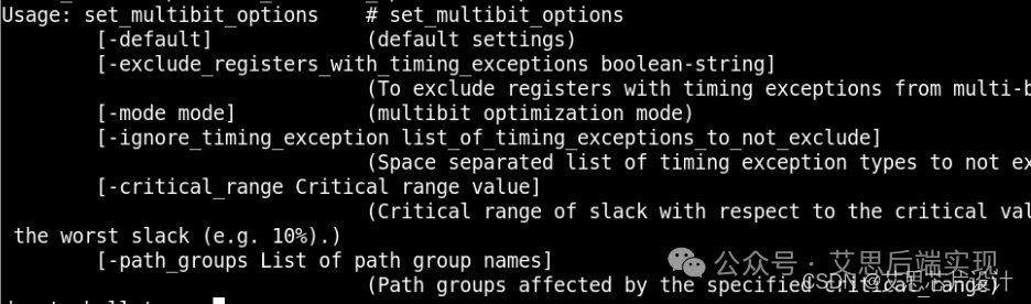 Compile命令,通過下列命令set_multibit_options對MBFF的實(shí)現(xiàn)進(jìn)行配置,已完成從unmapped MBFF到真實(shí)的MBFF的實(shí)現(xiàn)PS:顧名思義,這個(gè)步驟也需要目標(biāo)工藝庫提供MBFF的支持,因?yàn)樵趀laborate的時(shí)候,只是一個(gè)基于邏輯的MBFF評(píng)判,最終的實(shí)現(xiàn)還是在compile掛靠工藝庫的操作
