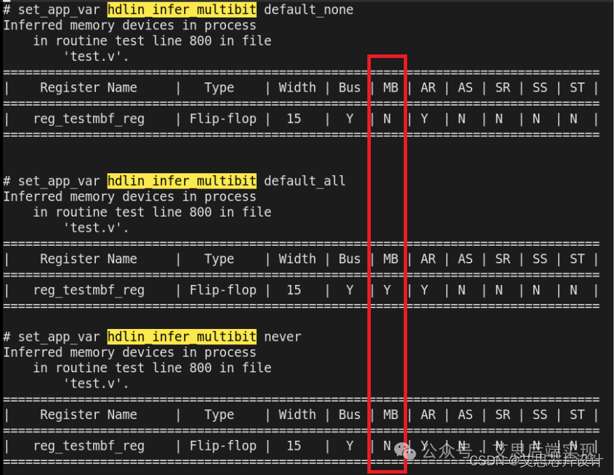 - default_all: DC根據(jù)RTL代碼的邏輯連接關(guān)系,主動(dòng)地去做MBFF的識(shí)別,無論是不是使用原語infer_multibit,DC都會(huì)根據(jù)邏輯連接關(guān)系,盡量進(jìn)行MBFF的封裝,除非DC遇到禁止MBFF封裝的原語(后文會(huì)提供細(xì)節(jié))。