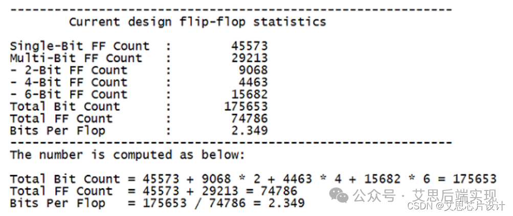 任何階段設(shè)置了setOptMode配置,任何階段使用place_opt_design | optDesign等命令,都會(huì)根據(jù)這個(gè)設(shè)定進(jìn)行相應(yīng)的優(yōu)化,這個(gè)選項(xiàng)也會(huì)被完整地保存在invs的數(shù)據(jù)庫(kù)中。在invs的任何優(yōu)化后的數(shù)據(jù)庫(kù)中,可以使用命令reportMultiBitFFs -statistics 對(duì)MBFF的替換結(jié)果進(jìn)行統(tǒng)計(jì)報(bào)告:
