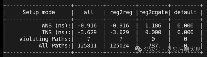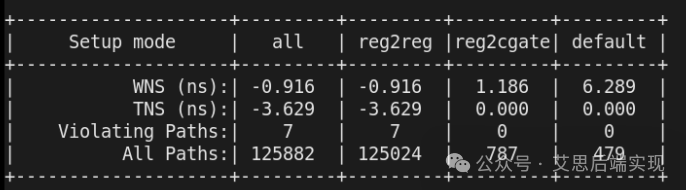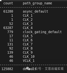 如果用戶去query這個某個path的path_group_name屬性,這個會立刻現(xiàn)實類似S家的策略:所有的EP都是基于clock domain的,同時你也可以看到S家里邊熟悉的異步和clock gating 組,譬如下面的統(tǒng)計結(jié)果
