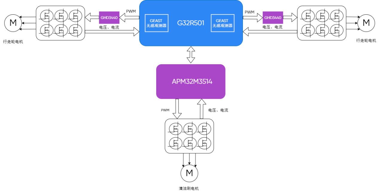 在雙輪驅(qū)動(dòng)控制上,G32R501可通過FOC算法,實(shí)現(xiàn)對(duì)電機(jī)的精準(zhǔn)轉(zhuǎn)矩與轉(zhuǎn)速控制,確保機(jī)器運(yùn)動(dòng)平穩(wěn)流暢。同時(shí),結(jié)合內(nèi)置的GEAST無(wú)感觀測(cè)器,可在無(wú)需額外位置傳感器的情況下精確獲取轉(zhuǎn)子信息,簡(jiǎn)化系統(tǒng)設(shè)計(jì)、降低成本,提升可靠性。此外,芯片內(nèi)嵌HeliumTM@邊緣AI加速單元和極海自研紫電數(shù)學(xué)指令擴(kuò)展單元,可高效優(yōu)化清洗軌跡,相較于傳統(tǒng)自動(dòng)化設(shè)備可提升40%的清洗效率。