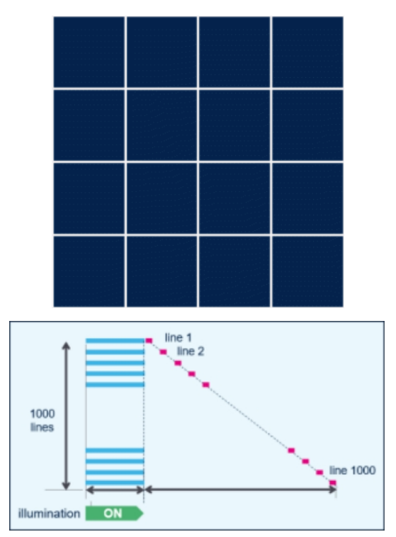 顧名思義,卷簾快門圖像傳感器是像素陣列逐行或數(shù)行依次曝光,像開啟卷簾一樣。每行曝光與數(shù)據(jù)處理同步進(jìn)行,逐漸構(gòu)建一幅完整幀。這種曝光方式比較簡單,無需全局快門的額外存儲單元和電路,因此,功耗較低,像素感光度較高。因為用于收集光線的像素面積較大,卷簾快門在弱光環(huán)境下成像質(zhì)量更好。因此,卷簾快門CMOS傳感器被廣泛用于大多數(shù)消費電子產(chǎn)品。然而,由于沒有中間存儲單元同步暫存整個幀,卷簾快門的成像容易產(chǎn)生畸變和偽影;此外,在所有行依次曝光過程中,光源必須保持點亮狀態(tài),這會增加整體光源成本。