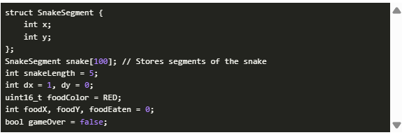 這一部分定義了蛇的結構和運動、食物和游戲狀態(tài)的必要變量。