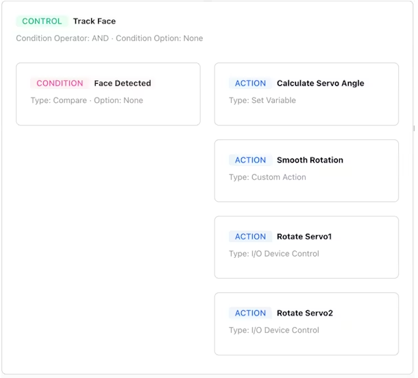 構(gòu)建面部跟蹤系統(tǒng)傳統(tǒng)上需要復(fù)雜的編程:實(shí)現(xiàn)計(jì)算機(jī)視覺庫(OpenCV)、管理相機(jī)流、處理AI模型推理、計(jì)算坐標(biāo)變換、集成伺服電機(jī)控制庫、實(shí)現(xiàn)平滑濾波器以及協(xié)調(diào)所有這些組件。使用Grablo,你只需想“讓伺服器跟隨我的臉”,并安排視覺塊來實(shí)現(xiàn)它。