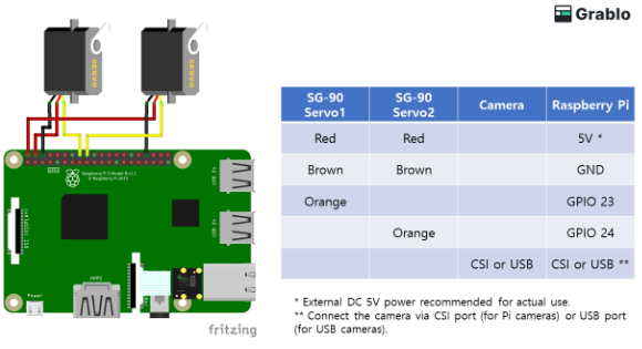 ?電源:在使用Pi的5V進(jìn)行測試時(shí),請使用外部5V直流電源(最小2A),以確保雙伺服系統(tǒng)穩(wěn)定運(yùn)行