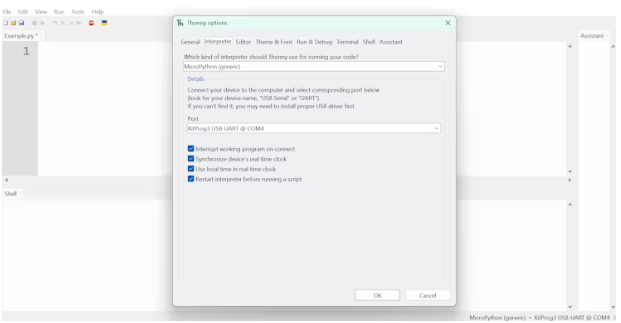 我們將使用ony IDE來運(yùn)行代碼。要連接到微控制器并使用MicroPython,請(qǐng)創(chuàng)建一個(gè)新文件,并按Tools > Options > Interpreter。在那里,將解釋器設(shè)置為MicroPython(通用),端口設(shè)置為KitProg3 USB-UART @您的COM端口(在本例中為COM4)。